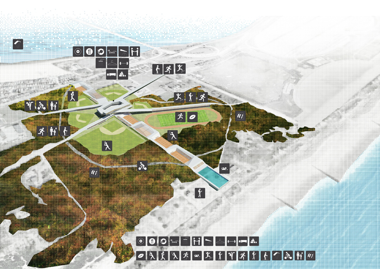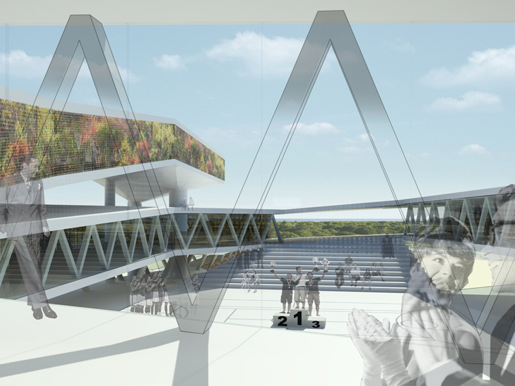 L’idée principale du projet d’un talus de terre, s’inspire par les installations militaires abandonnées. Des éléments lineaires “pistes” se croisent au centre sportif «play the LOOP».